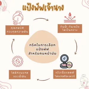 - เลือกแป้งที่มีคุณสมบัติควบคุมความมันส่วนเกินบนใบหน้าได้ดี ติดทนนาน ไม่เยิ้มระหว่างวัน