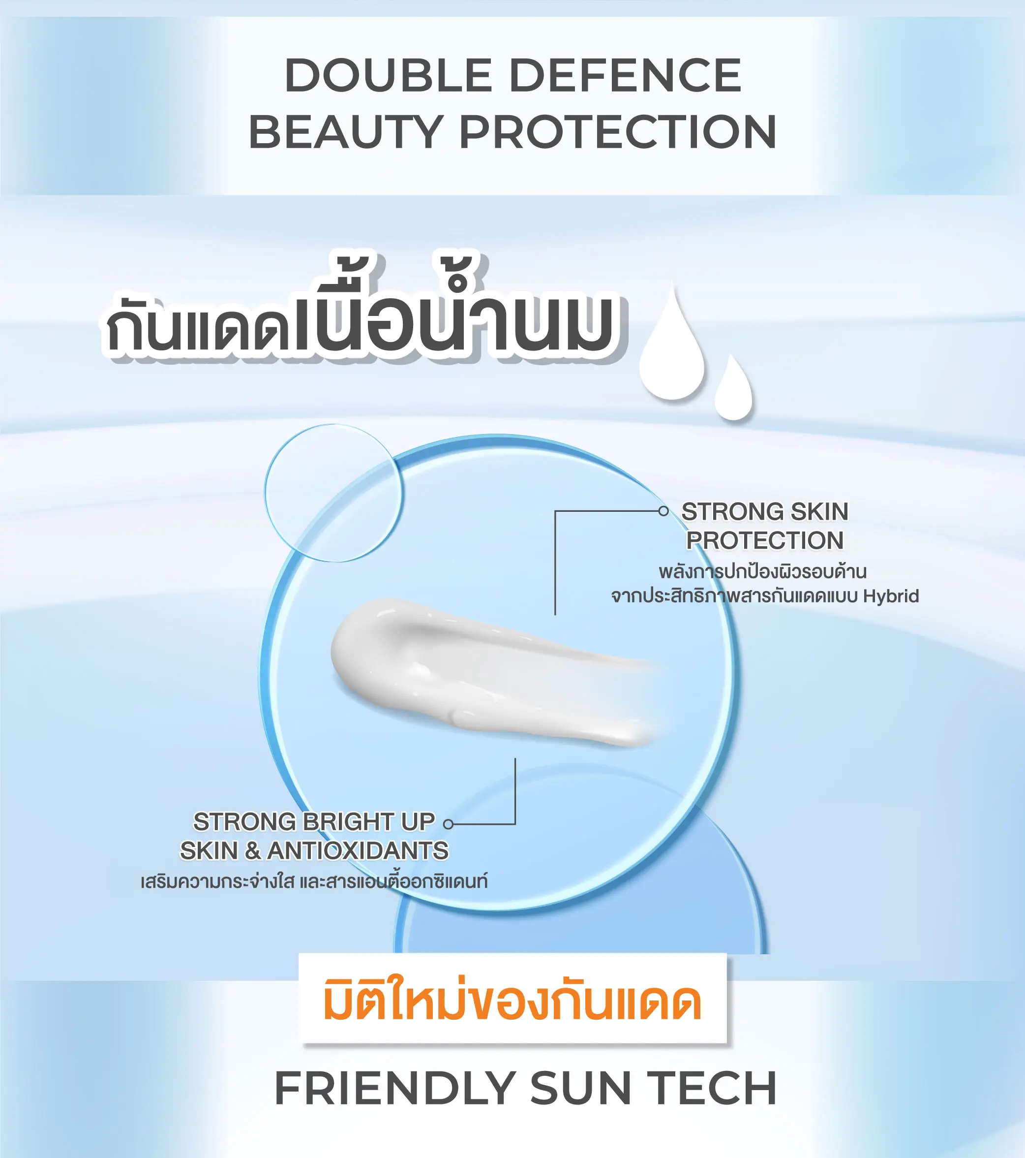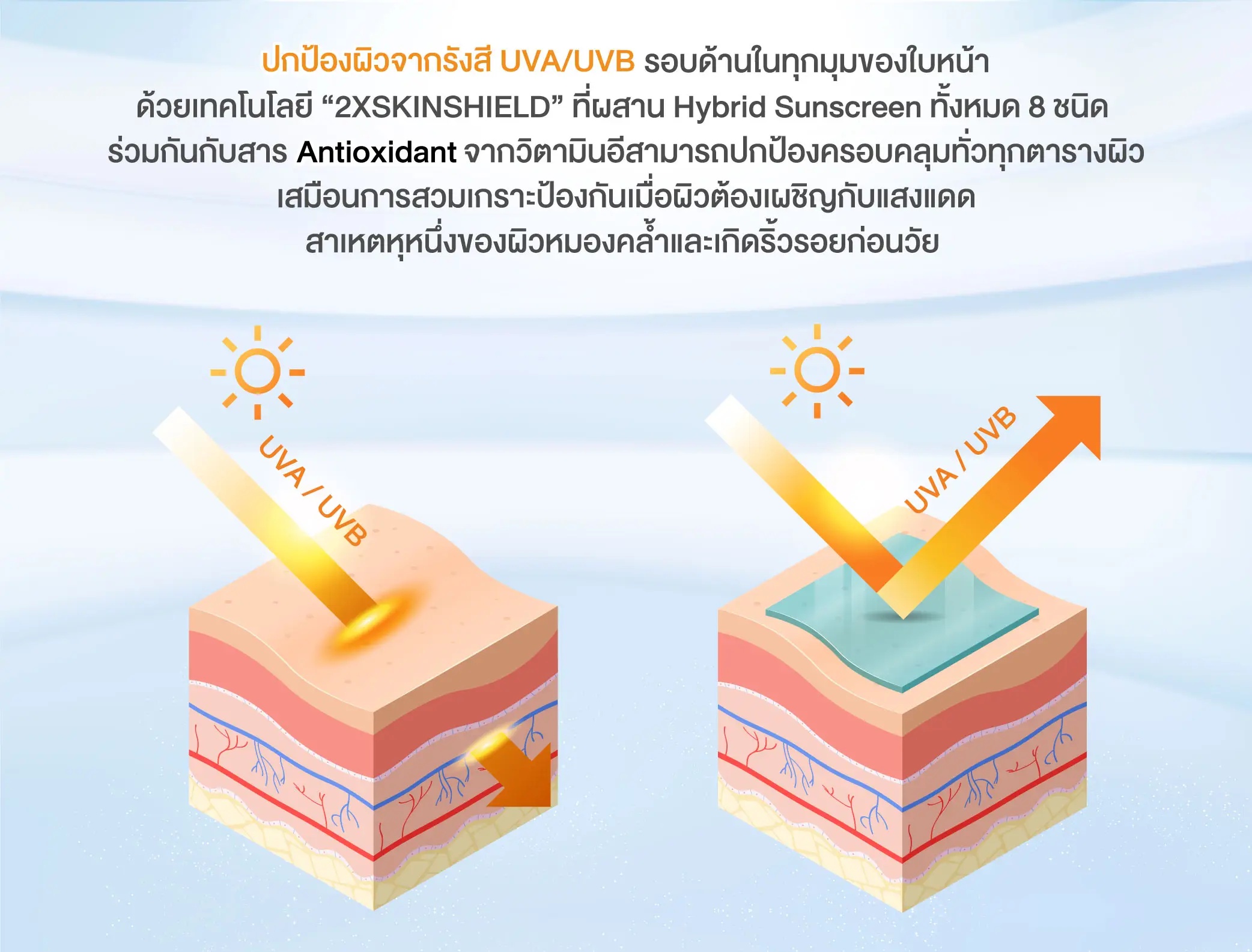ซึ่งเป็นสาเหตุของการเกิดริ้วรอยก่อนวัย ไม่ก่อให้เกิดการอุดตัน ด้วยเทคโนโลยี 2X SKINSHIELD ซึ่งผสาน Hybrid Sunscreen 8 ชนิด ที่ทำงานร่วมกันกับ Antioxidant ของวิตามินอี สามารถฟื้นฟูความหมองคล้ำจากแสงแดด