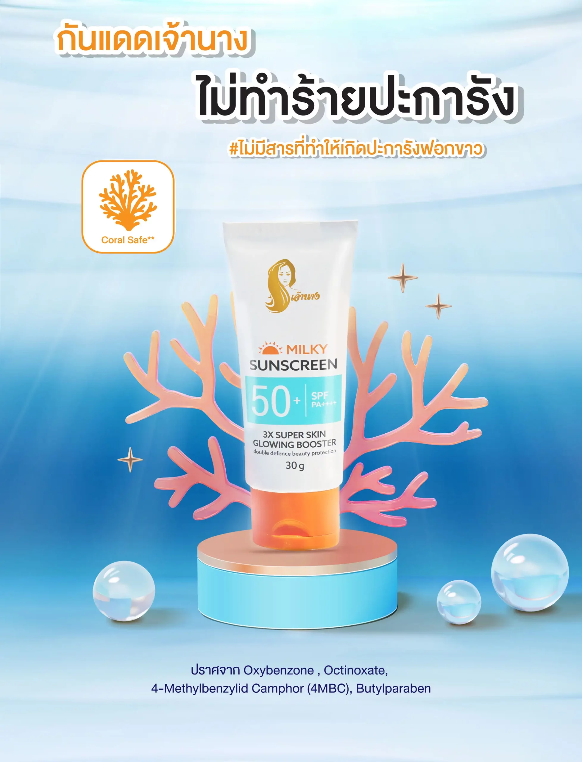 พร้อมสารสกัดที่ช่วยมอบความชุ่มชื้น และบำรุงผิวกระจ่างใสด้วย 3X SUPER SKIN GLOWING BOOSTER ที่คืนความชุ่มชื่นให้แก่ผิว ปลอบประโลมผิวที่ถูกทำร้ายจากแสงแดด ลดเลือนจุดด่างดำ พร้อมปรับสีผิวให้กระจ่างใสอย่างเป็นธรรมชาติ ปราศจากสารอันตรายที่ก่อให้เกิดการระคายเคือง ไม่มีพาราเบน และส่วนผสมน้ำหอม สามารถใช้ได้กับทุกสภาพผิว ไม่ทำร้ายปะการังและสิ่งแวดล้อม